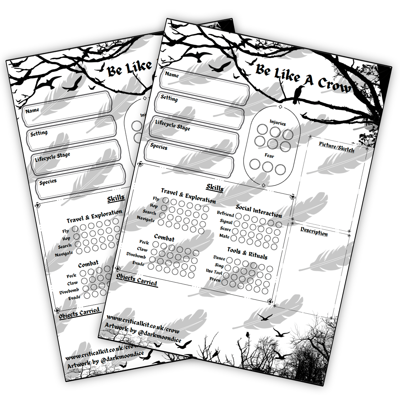 An exclusive new design for our Be Like a Crow character sheet created by Dark Moon Dice.